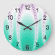 Large round wall clock features abstract fractal art in purple and green gradient with black numerals.