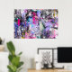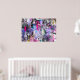 A wonderful messy, grungy mix of paint strokes, splatters and marks in a colourful palette of purple, pink, blue, green, yellow, black and white.