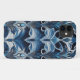 A beautiful abstract design of indigo blue and white waves in a leafy or modern take on a damask pattern, with sapphire jewels at the bottom.