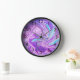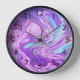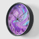 Abstract digital art round clock featuring purple and light blue liquid swirly design with black numerals.