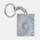 This monochrome keychain features an abstract spiral fractal design in light grey and black.