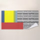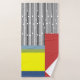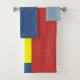 This towel set has a light blue washcloth, a darker blue hand towel, and a bath towel with a design of broken black lines running vertically into rectangles of light blue, green, blue, yellow, and red. Want different colours? Message me.