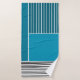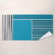 This towel set has a black washcloth, a teal hand towel, and a bath towel with a geometric design of a large teal rectangle in the upper left corner, darker teal stripes in the upper right corner, a lighter smaller teal rectangle below the stripes, and black lines across the bottom. If you like the design but prefer different colours, message me.