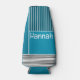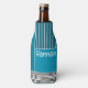 This bottle cooler has a geometric design of a large teal rectangle in the upper left corner, darker teal stripes in the upper right corner, a lighter smaller teal rectangle below the stripes, and black lines across the bottom. If you like the design but prefer different colours, message me.