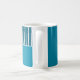 This mug has a geometric design of a large teal rectangle in the upper left corner, darker teal stripes in the upper right corner, a lighter smaller teal rectangle below the stripes, and black lines across the bottom. If you like the design but prefer different colours, message me.