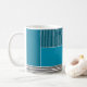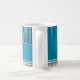 This mug has a geometric design of a large teal rectangle in the upper left corner, darker teal stripes in the upper right corner, a lighter smaller teal rectangle below the stripes, and black lines across the bottom. If you like the design but prefer different colours, message me.