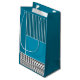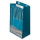 This gift bag has a geometric design of a large teal rectangle in the upper left corner, darker teal stripes in the upper right corner, a lighter smaller teal rectangle below the stripes, and black lines across the bottom. If you like the design but prefer different colours, message me.