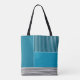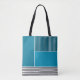 This tote bag has a geometric design of a large teal rectangle in the upper left corner, darker teal stripes in the upper right corner, a lighter smaller teal rectangle below the stripes, and black lines across the bottom. If you like the design but prefer different colours, message me.