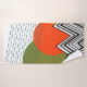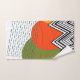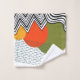 This towel set has a mid-century modern design of curvy and zigzag lines in black, circles in yellow, orange, and green, and a rectangle made from dashed teal lines. If you want the same design with different colours, message me.