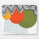 This mouse pad has a mid-century modern design of curvy and zigzag lines in black, circles in yellow, orange, and green, and a rectangle made from dashed teal lines. If you want the same design with different colours, message me.