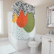 This shower curtain has a mid-century modern design of curvy and zigzag lines in black, circles in yellow, orange, and green, and a rectangle made from dashed teal lines. If you want the same design with different colours, message me.
