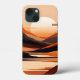 A minimalist, abstract landscape in shades of red-orange, brown, and tan with hills, a river, and an enormous setting sun creates a beautiful phone case.