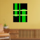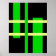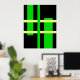 A minimalist modern abstract geometric art design of lines and blocks in green and yellow colors on a black background.
