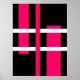 A minimalist modern abstract geometric art design of lines and blocks in bright pink and white colors on a black background.