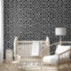 This peel and stick wallpaper showcases an intricate geometric pattern that exudes modern elegance. The design features interconnected shapes, predominantly diamonds and triangles, creating a captivating lattice structure. The colour scheme is monochromatic, with bold black lines against a crisp white background. This minimalist palette allows the pattern to stand out without overwhelming the space. The graphic style draws inspiration from traditional Moroccan tiles, known for their geometric precision and timeless appeal. When applied, this wallpaper adds depth and movement, making it a striking choice for any interior.