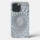 This monochrome iPhone case features an abstract spiral fractal design in light grey and black.