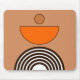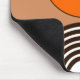 This mouse pad has a geometric design of an orange half-circle above black and white arches with a tan circle above it all.