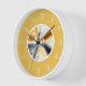 This round wall clock features an abstract fractal art in orange, white and black on a white round frame and a pastel orange background with white numerals.