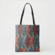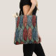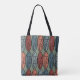 This tote bag has an art deco design of ovals with abstract designs within each in retro colours of pink and blue.