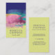 Colourful metallic painted brush strokes with a navy blue and lime green background add artistic style to this unique business card. It works well for creative professions, artists, gallery owners, arts and crafts, designers, graphic artists, fashion industry and many other fields of business. It also works well as a personal calling card.