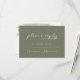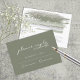A paint strokes watercolor in sparkling shades of olive green with splashes of lavender accents the pieces of this beautiful wedding suite. The wedding 'RSVP' card shown here also features elegant handwritten calligraphy and plenty of space for your text. Easily add your own names, wedding date and menu selections using the provided template. Search ID886 to see other pieces and colour choices for this set.