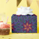 Trippy paisley style shapes with star shaped flowers. Blue, green, orange and purple colours.