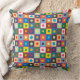 An abstract pattern made up of hand drawn spotted squares in in various colour combinations on a flat coloured background