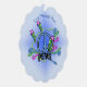 This hanging ornament card has a blue peace sign with the text Peace in an abstract design of pink blue, and green scrolls and stars on a blue background. Customise your text with the templates on the front and back.