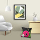Bold colours of pink flamingo on a black background with green foliage accents