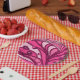 A Daliesque print, this abstract pink painting by Tina Kafantaris features twisted, melted lines segmented into three panels. A vibrant surrealist print that would look great on a number of products. Get yours today!