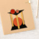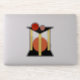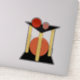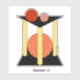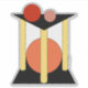 In this abstract artwork, an orange circle sits between three yellow pillars standing on a square or rectangular base, while a red and soft red circle sit upon a triangular platform atop the pillars.