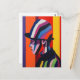 This is an abstract profile portrait of a person wearing a bowler hat, set against a bold, multicolored background. The subject’s face is composed of segmented shapes in vibrant shades of pink, purple, blue, and black, blending into the fluid, striped patterns of their hat and clothing. The vertical background stripes—orange, red, yellow, and purple—enhance the striking, modern feel of the piece. The interplay of contrasting colours and geometric forms creates a unique visual experience, blending abstraction and fashion