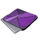 Inspired by stained glass, this stylish geometric design contains polygons in various shades of purple outlined in black. A lavender triangle slashes in from the upper right with an array of progressively darker purple quadrangles and other shapes spiralling around it from light to dark. Two dark purple shapes ground the left side of the original design.