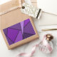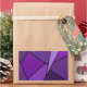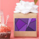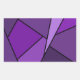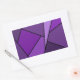 Inspired by stained glass, this stylish geometric design contains polygons in various shades of purple outlined in black. A lavender triangle slashes in from the upper right with an array of progressively darker purple quadrangles and other shapes spiralling around it from light to dark. Two dark purple shapes ground the left side of the original design.