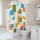 This shower curtain has a mid-century modern design of rectangles and lines in 1960s colours.