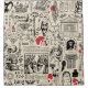 Abstract seamless pattern on the theme of theater and drama with black pencil drawings and red blots in vintage style.