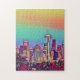 This abstract design of the Seattle skyline shows an image of the Seattle cityscape in multiple colours.