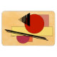 A black triangle divided into segments, a black trapezoidal band divided into two, a red circle, a yellow rectangle, a pale red square, a purplish circle, and an orange square feature in this abstract art of overlapping shapes by Richard H. Fay.