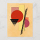 A black triangle divided into segments, a black trapezoidal band divided into two, a red circle, a yellow rectangle, a pale red square, a purplish circle, and an orange square feature in this abstract art of overlapping shapes by Richard H. Fay.
