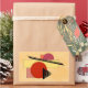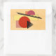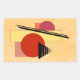A black triangle divided into segments, a black trapezoidal band divided into two, a red circle, a yellow rectangle, a pale red square, a purplish circle, and an orange square feature in this abstract art of overlapping shapes by Richard H. Fay.