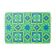 Bath mat in a geometric abstract star pattern In shades of lime green, cerulean blue and turquoise, accented with deep blue