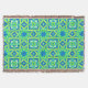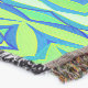 Throw in a geometric abstract star pattern In shades of lime green, cerulean blue and turquoise, accented with deep blue