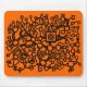 A mouse pad with an quirky hand drawn abstract surreal design, a network of shapes link together with wire like shapes which looks both natural and machine like.