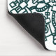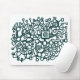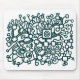 A mouse pad with an quirky hand drawn abstract surreal design, a network of shapes link together with wire like shapes which looks both natural and machine like.