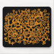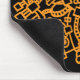 A mouse pad with an quirky hand drawn abstract surreal design, a network of shapes link together with wire like shapes which looks both natural and machine like.