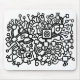 A mouse pad with an quirky hand drawn abstract surreal design, a network of shapes link together with wire like shapes which looks both natural and machine like.