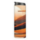 An abstract landscape with a large, white sun setting over mountains and a river, done in red, ochre, browns, and orange, to create a beautiful travel mug. Personalise with your name down the left side.