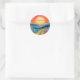 Explore the captivating beauty of an abstract painting of a sunset over a field. The sky comes in a palette of gradient pinks and oranges, with the sun enthroned at the top of the painting. The field, a mixture of blue, green and yellow, is crossed by a dirt road, creating a unique visual harmony.