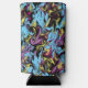 Abstract art with swirls of black, yellow, pink, blue and purple. Plain black circle on the bottom of the bottle holder.
