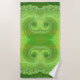 This beach towel features a symmetrical spiral fractal pattern in green shades.